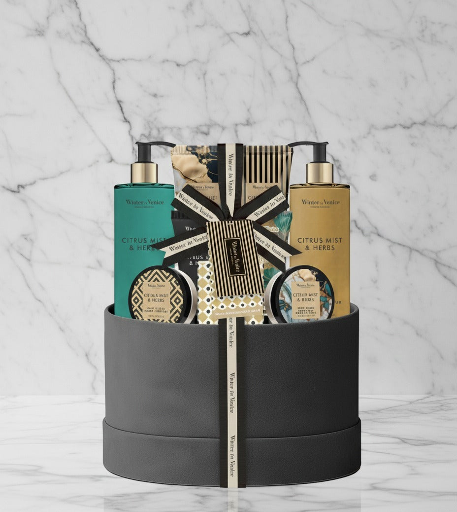 Treat yourself or someone special to this sophisticated black suede hat box filled with a curated selection of bath and body essentials. Infused with fresh Citrus & Mist fragrance, this set is uplifting, clean, and gently calming—perfect for gifting or indulging in a little self-care.