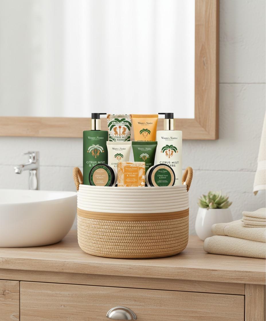 Treat yourself or someone special to this charming natural cotton rope basket, filled with a curated selection of bath and body essentials. Infused with fresh Citrus & Mist fragrance, the set is uplifting, clean, and gently calming—perfect for gifting or indulging in moments of self-care.